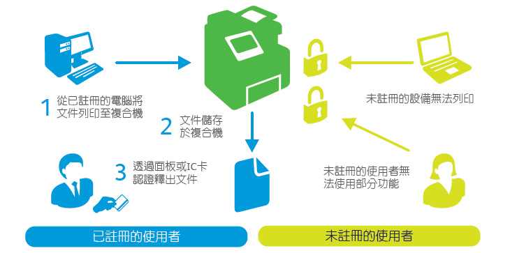 • 使用者認(rèn)證管理 內(nèi)建權(quán)限控管功能可管理至多1000名使用者,文件送出後可先暫存於複合機(jī)硬碟中,直至文件所有者於機(jī)器上輸入密碼才進(jìn)行列印。亦可透過原廠內(nèi)嵌式(選購)或外接式讀卡機(jī)(選購)進(jìn)行身份認(rèn)證,對(duì)各使用者可用功能及彩色輸出等權(quán)限進(jìn)行管制。