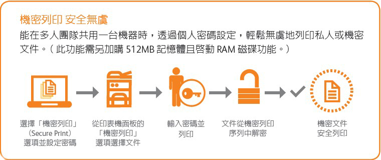 • 機(jī)密列印 機(jī)密文件可以密碼保護(hù),並確保其在網(wǎng)路傳輸過程中以加密狀態(tài)傳送,需於控制面板輸入密碼之後才能列印,避免他人窺視。(此功能需另加購512MB 記憶體且啟動(dòng)RAM 磁碟功能,或加購硬碟套件。)