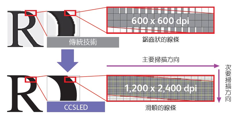 •快速色彩修正 IReCT 影像定位控制技術(shù),以超精細(xì)的畫素控制精準(zhǔn)修正失真的影像,將畫素填入縫隙中,使鋸齒狀的邊緣更加平滑,提升個(gè)別字元與細(xì)線的列印品質(zhì)。